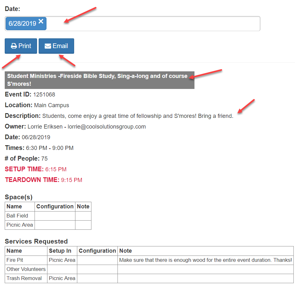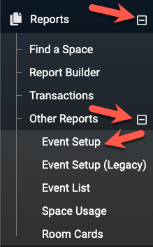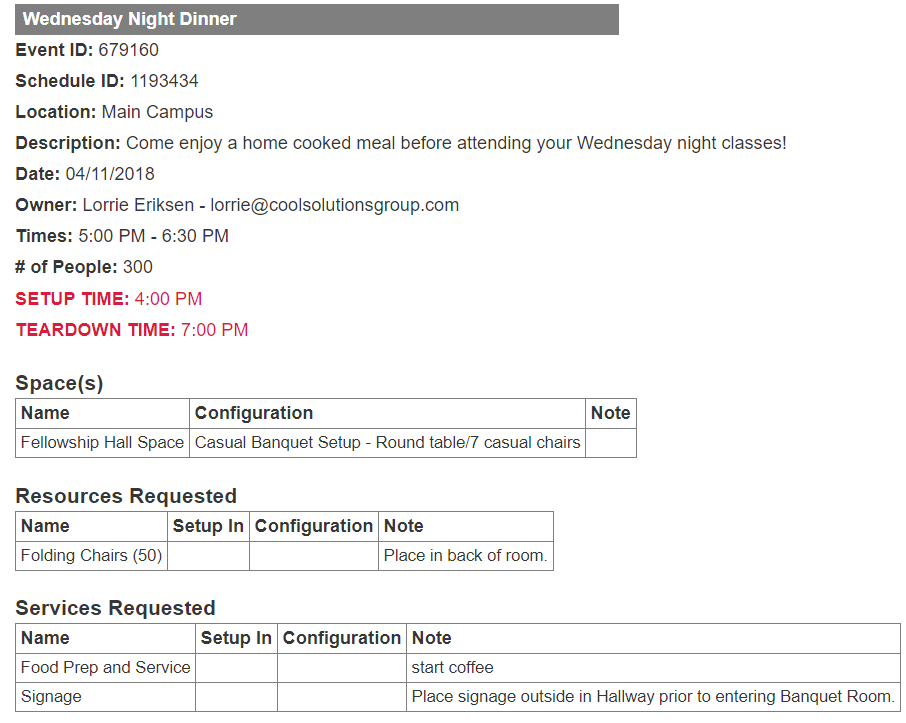 Event Setup is designed to easily see the setup details and Form Q&A on events for facilities so they can easily see the needs of the event. This report shows facilities teams all the setup details for spaces, resources and services on an event.