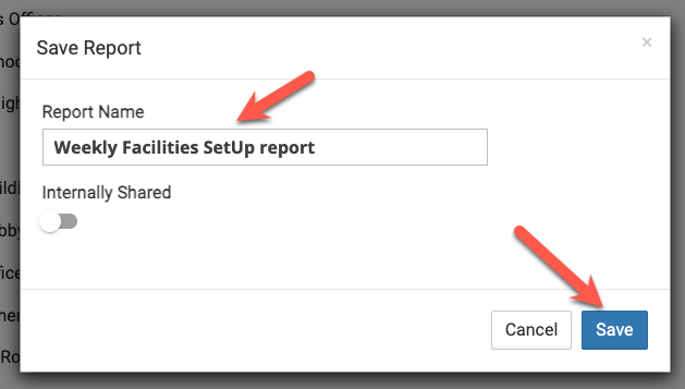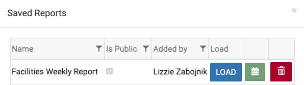 You can also select Save Report which saves all of your selected criteria and adds it to a library ( Saved Reports ) for future use. You can name the report and mark the report Public to share with other users within your organization or keep it Private (see below).