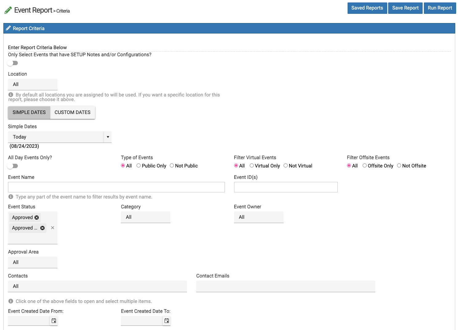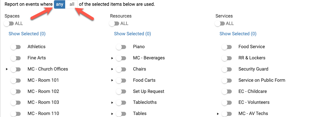 - Next , you have the option to search for events that have " ALL " items that are selected below OR " Any " of the items selected below (with exception of Space Usage or Room Cards reports).