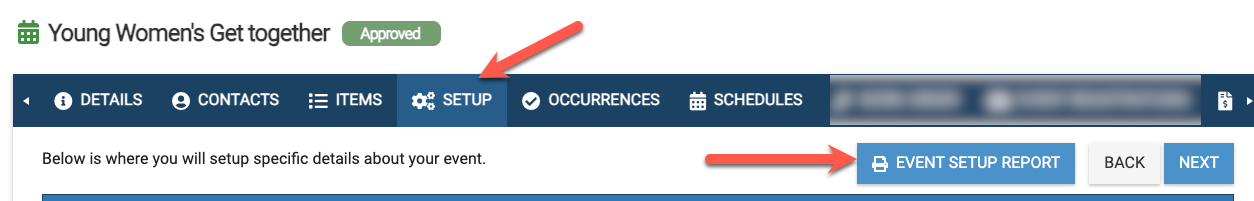 Once an event is in an approved status, the event setup report can be viewed for that event on the Setup tab by clicking Event Setup Report.